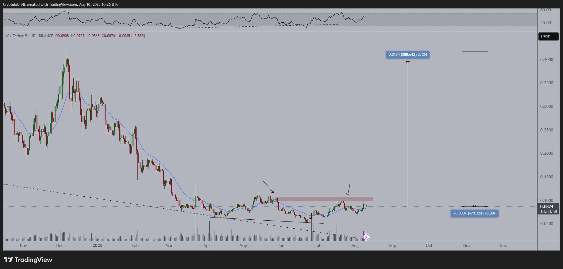 He highlights Optimism ($OP) and Wormhole ($W) as key examples, noting that OP is nearing an important breakout point at $0.90, while W approaches its pivotal $0.10 level.