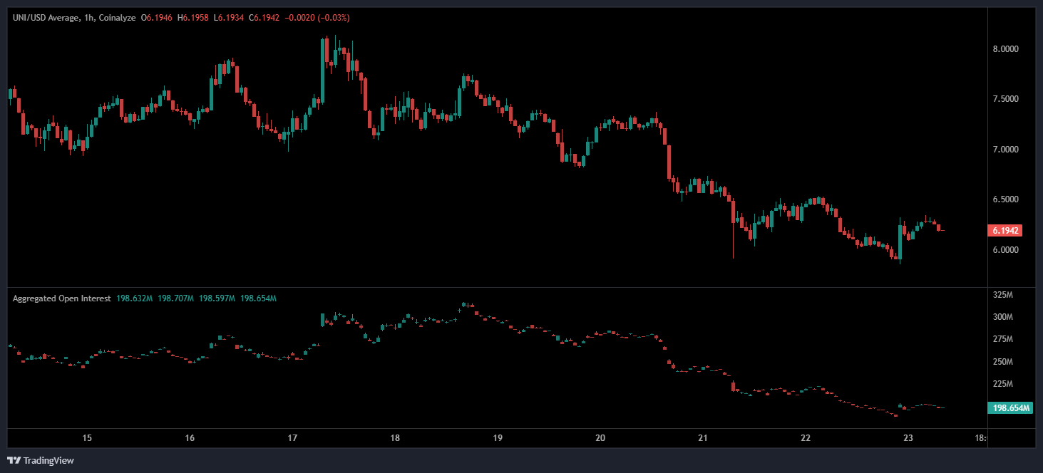 Higher-timeframe charts show UNI trading within a broader $5.90 to $6.40 range, consistent with the tight near-term consolidation seen on the hourly windows. The market appears to be searching for direction as spot liquidity holds steady but fails to translate into decisive upward or downward follow-through.