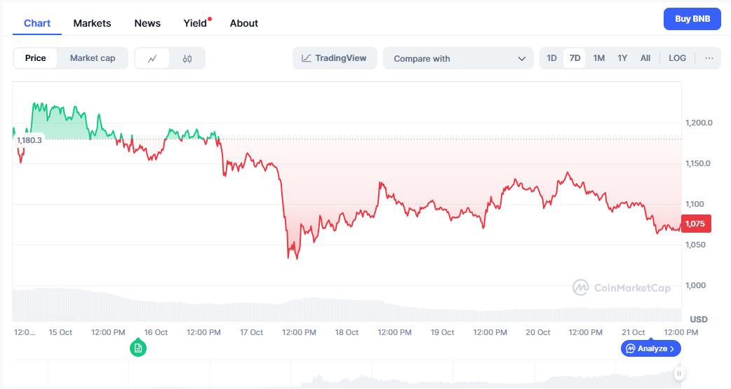 The Binance Coin price is trading along the $1,000-$1,150 range. CoinMarketCap data shows the cryptocurrency is still down by 12.9% on the 7D chart despite a recent uptick.