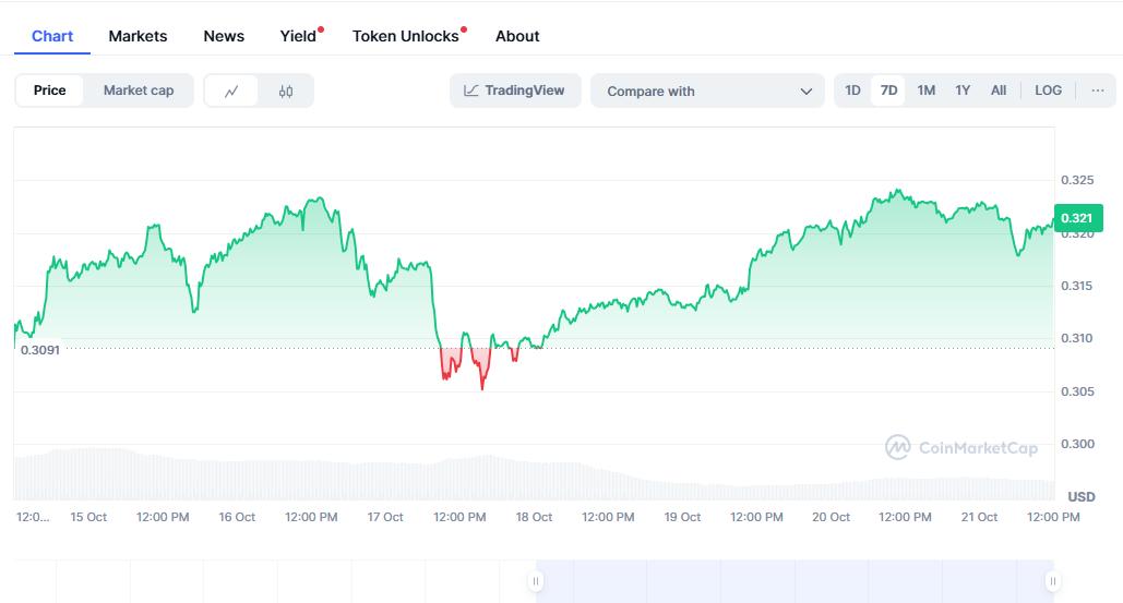 CoinMarketCap data shows that the Tron price has been moving within a tight range during the last week. Compared to other coins in the market, the TRX price is down by only 0.3% and is up by 3.3% on the 7D chart, which is an indication of great strength by bulls.