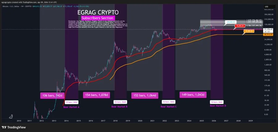 Analyst Egrag Crypto highlighted that Bitcoin is currently trading in a “decision zone.” The price is positioned on a mid-cycle support marked by a red moving average. This level has historically influenced trend direction in previous cycles.