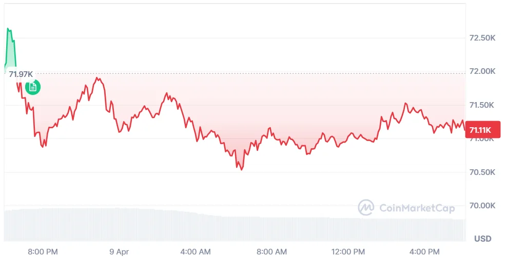 As of writing, Bitcoin (BTC) is trading at $71,128, showing a decline of 2.13% in the past 24 hours. The trading volume is down by 30.35% and is currently standing at $35.27 billion. Over the last week, the BTC price has increased by 7.72%, according to CoinMarketCap.