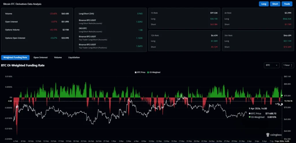 According to CoinGlass data, the futures volume has decreased by 23.60% and is currently at $60.40 billion. Open interest is down by 2.07% to $51.89 billion. The OI-weighted funding rate is at 0.0010%, indicating a marginally bullish sentiment.