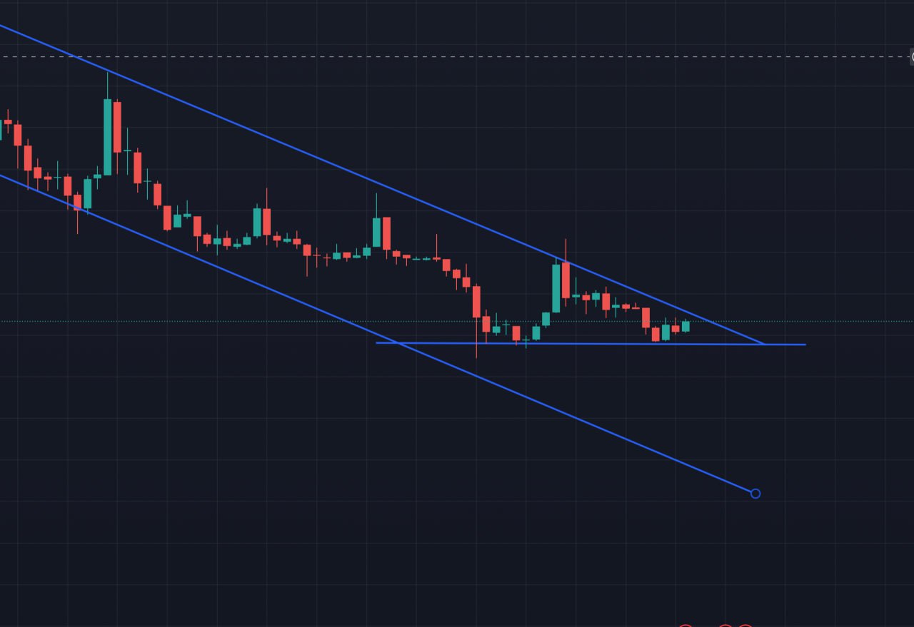 Looking at the price chart, Pi Coin has been locked in a clear downward channel, making lower highs and lower lows. However, recent price action shows that PI is consolidating along a flat support level, while the descending resistance line continues to compress the range.