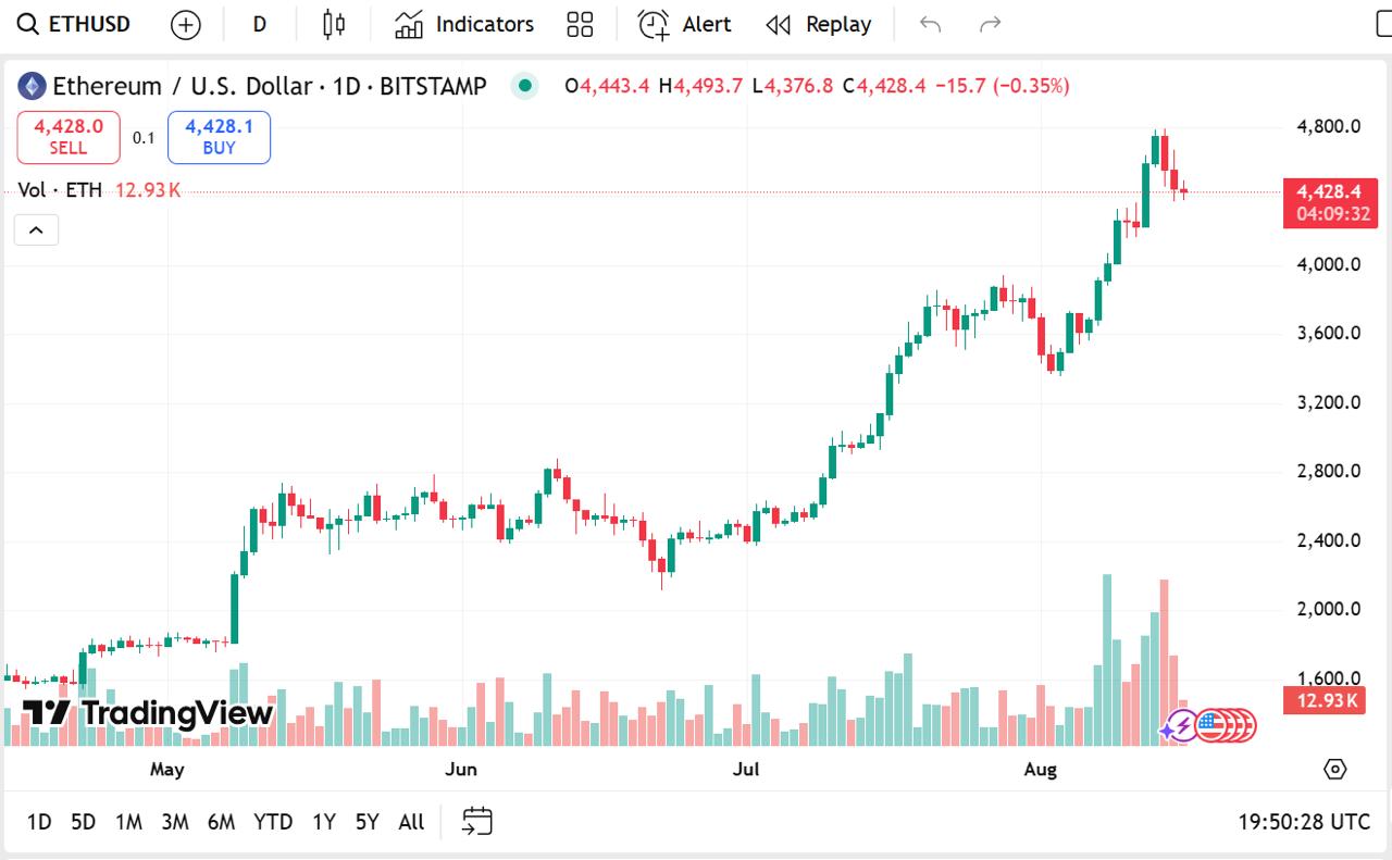 Ethereum is trading at a price of $4,415.95, 1.08% lower over the last 24 hours. It has a market capitalization of $533.02 billion, ranking only second to Bitcoin. Daily volume dropped by 24.56% to $42.82 billion, but institutional investor demand remains strong.