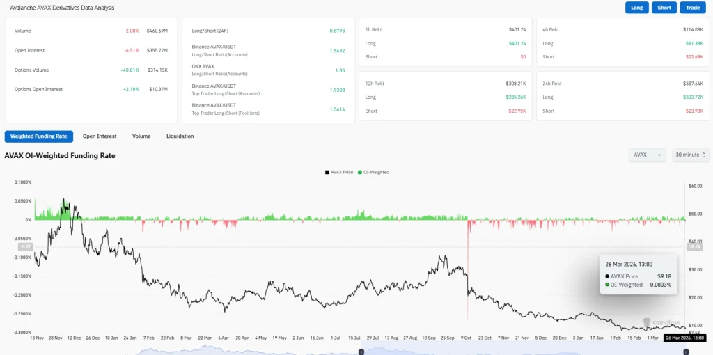 The liquidation figure also shows that the market is imbalanced. The total liquidations in the last 24 hours have been $557.64K. Long liquidations have been higher at $533.72K. Short liquidations have been lower at $23.93K.