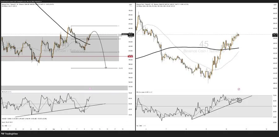 Charts show that higher timeframes reveal a rounded bottom with higher lows and bullish candles, while reclaiming a long-term moving average that now acts as dynamic support. On lower timeframes, BNB faces resistance at a descending trendline zone, suggesting that sellers remain active near this level.