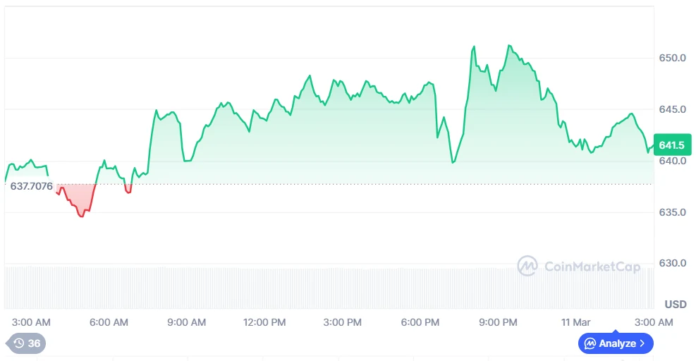 BNB is currently trading at $641.21, as of March 11, 2026, up 0.18% over the past 24 hours, with a trading volume of $1.6 billion, down 3.42%. Over the past week, the token has gained 1.79%, hovering near $641.50, reflecting gradual recovery after recent downward pressure.
