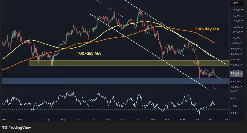 The price range of $60,000 to $61,000 is the major support level. It had shown some reaction in February and continued to hold prices from falling. On the upside, the next major resistance level for BTC was between $75,000 and $80,000, a range that has capped momentum for weeks.