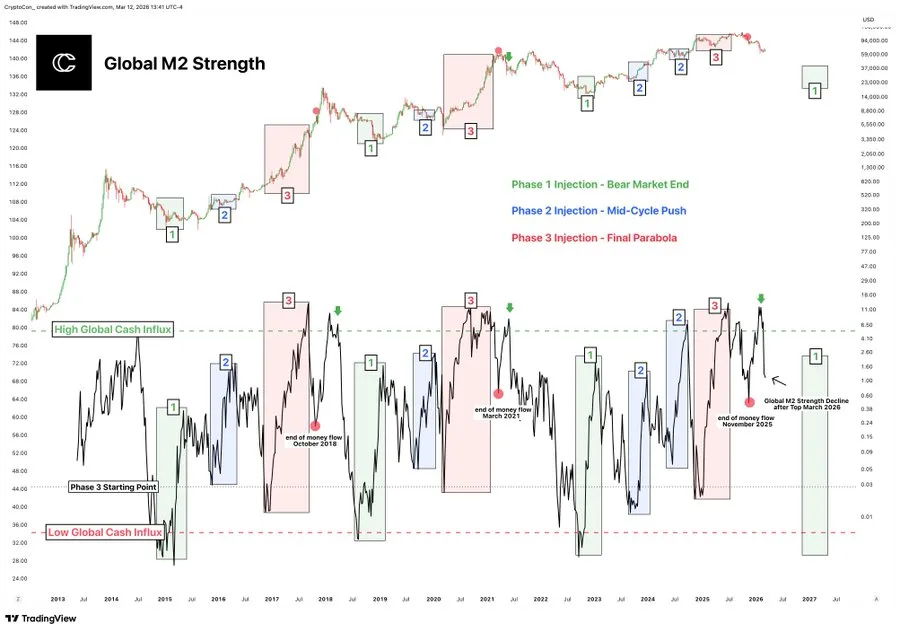 According to CryptoCon, after the peak in world M2 strength in November 2025, momentum driven by liquidity has started to decrease. This has often correlated with significant market tops and subsequent corrections.