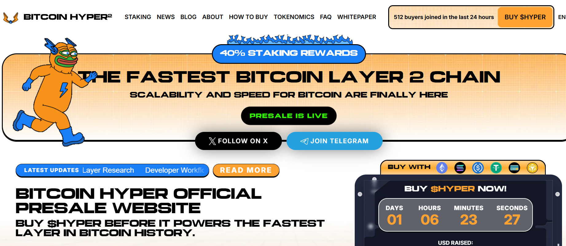 Bitcoin Hyper markets itself as “the fastest Bitcoin layer 2 chain,” pushing a story built around speed, low fees, and 40% staking rewards. The project highlights rollup research, execution-layer work, and a roadmap aimed at bringing payments, meme coins, and dApps onto Bitcoin in a scalable way.