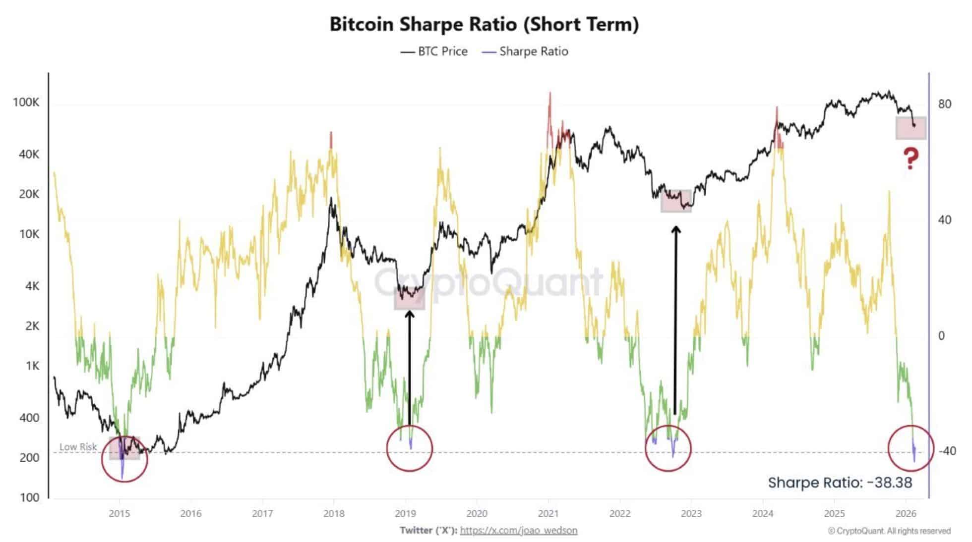Bitcoin vuelve a entrar en una fase psicológicamente compleja tras la reciente caída del Sharpe Ratio de corto plazo hacia niveles cercanos a -38, un punto que históricamente ha coincidido con zonas de capitulación más que con el inicio de nuevas tendencias bajistas prolongadas.