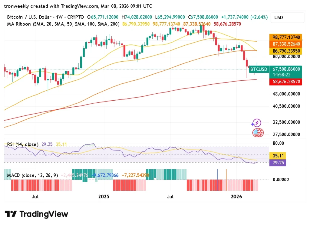 The Relative Strength Index (RSI) of BTC is at 29.25, which is closer to the oversold area, whereas the signal line is closer to the level of 35.11. The price is trading at $67,508 after a fall of $1,737 or 2.64% for the week.