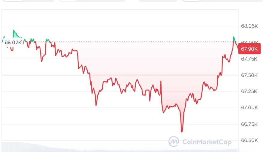 At the time of writing, Bitcoin (BTC) is trading at $67,901, with a 24-hour trading volume of $41.59 billion and a market capitalization of $1.35 trillion, according to CoinMarketCap. Over the last 24 hours, BTC has dipped by 0.39%, reflecting a cautious market atmosphere.