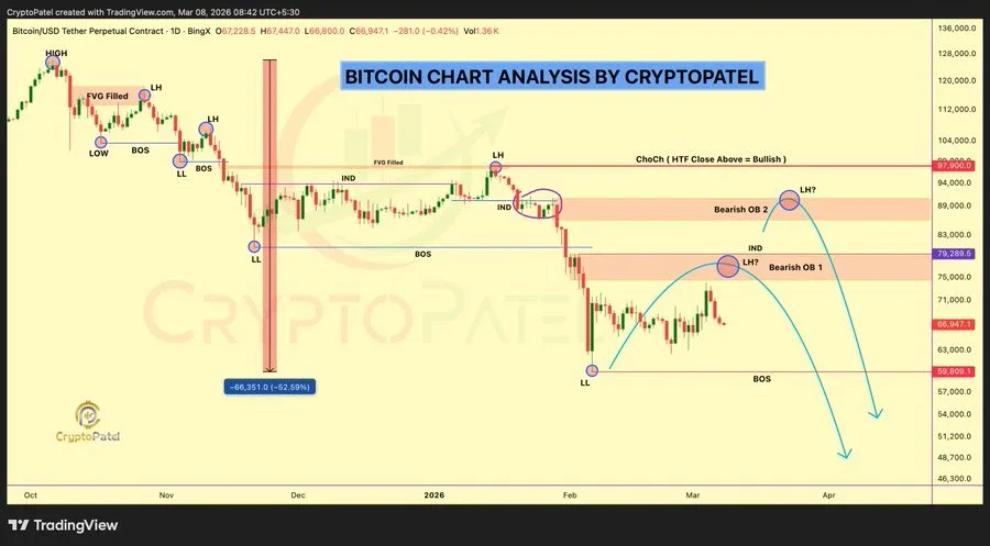 On March 8, 2026, crypto analyst Crypto Patel emphasized the following on Bitcoin: “As of now, the price of Bitcoin is ranging between $62,000 and $72,000, and this could be the area from where the next major price action could come from.”