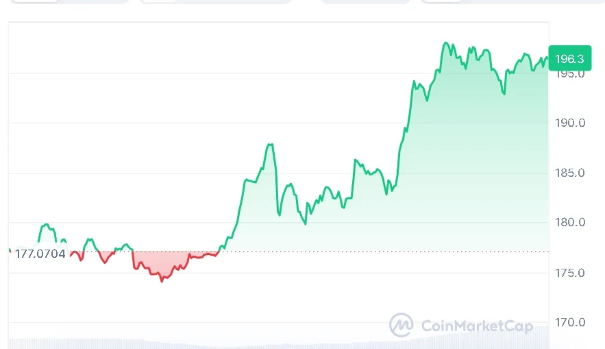 At the time of writing, Bittensor (TAO) is trading at $196.38, with a 24-hour trading volume of $404.69 million and a market capitalization of $2.12 billion. The cryptocurrency has seen a strong 10.55% increase over the last 24 hours, signaling growing market interest.
