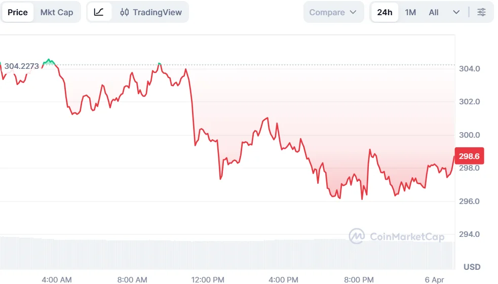 According to CoinMarketCap data, TAO is trading at $298.71, down 1.8% in the last 24 hours. Trading volume has declined by 16.06% to $148.25 million. Over the past seven days, the token has recorded a loss of 5.56%, reflecting recent market pressure.