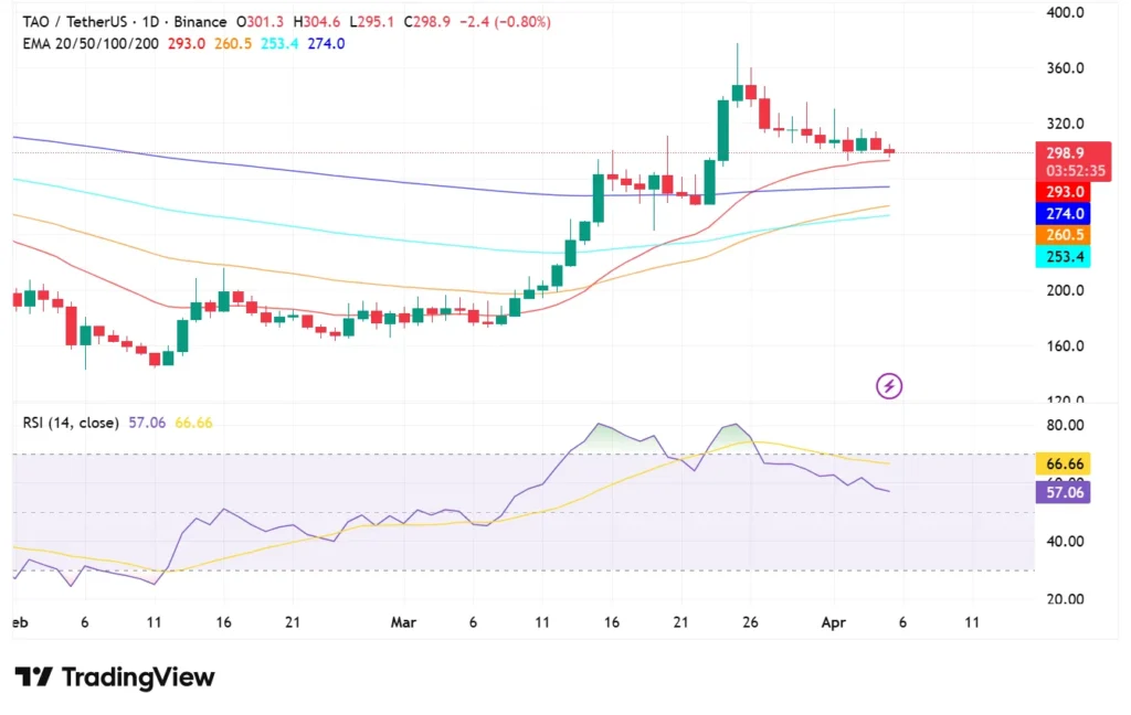 From a technical perspective, TAO still trades well above all major EMAs. The 20 EMA is trading at $293.0 and serves as immediate support. Meanwhile, the 50 EMA trades at $260.5, representing the next support level in case of a further decline in price.
