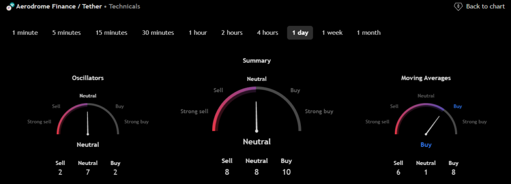 The technical analysis indicators such as Relative Volume (RVOL), Moving Average (MA), and Relative Strength Index (RSI) of Aerodrome Finance (AERO) are shown in the chart below.