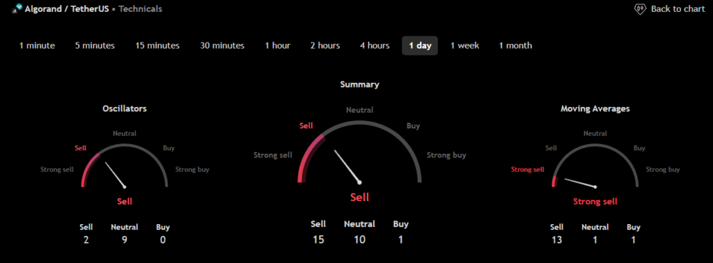 The technical analysis indicators such as Relative Volume (RVOL), Moving Average (MA), and Relative Strength Index (RSI) of Algorand (ALGO) are shown in the chart below.