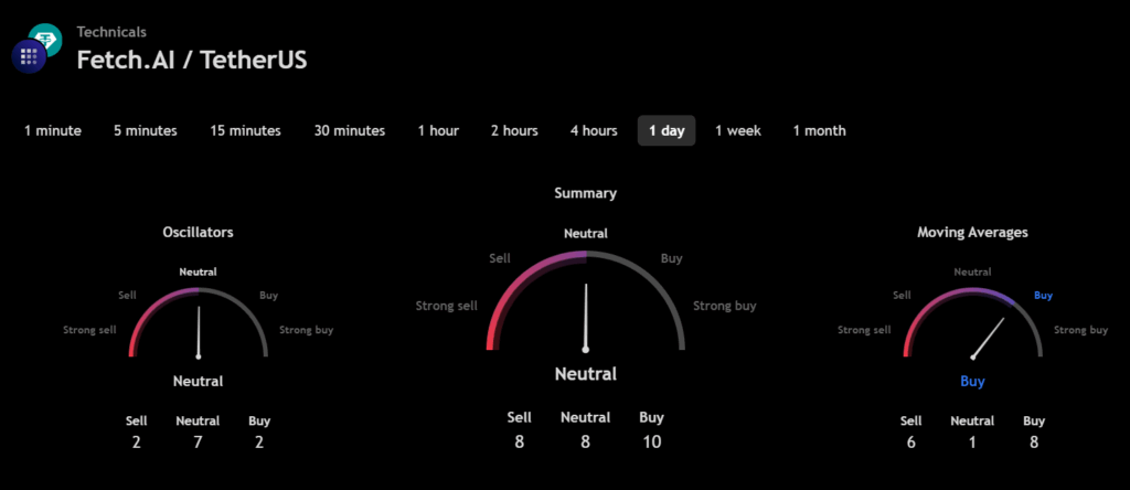 The technical analysis indicators such as Relative Volume (RVOL), Moving Average (MA), and Relative Strength Index (RSI) of Bitcoin (FET) are shown in the chart below.