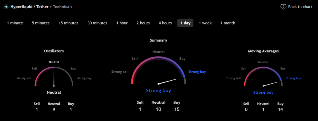 The technical analysis indicators such as Relative Volume (RVOL), Moving Average (MA), and Relative Strength Index (RSI) of Hyperliquid (HYPE) are shown in the chart below.