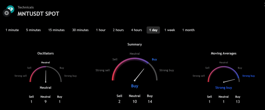 From the readings on the chart above, we can make the following inferences regarding the current Mantle (MNT) market in 2025.