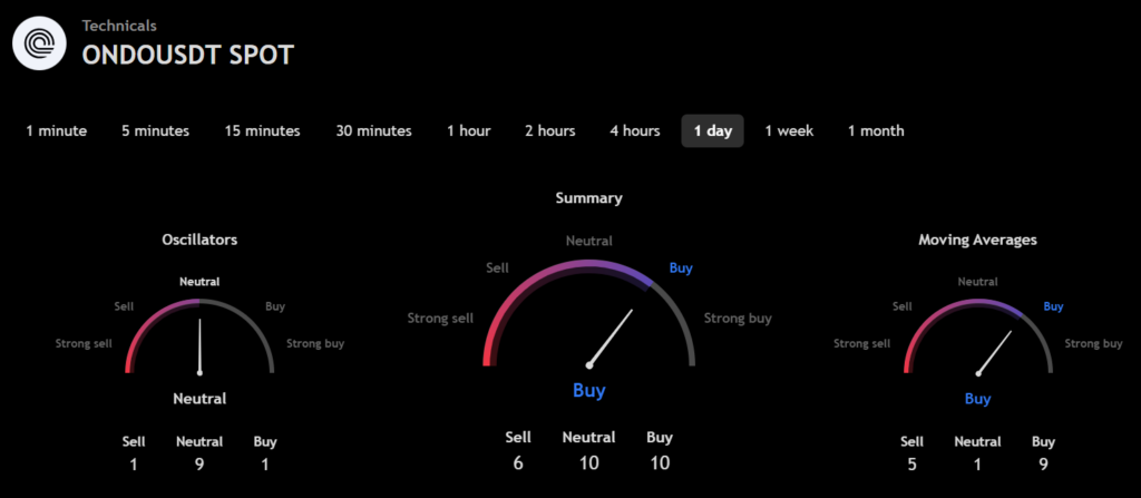 The technical analysis indicators, such as Relative Volume (RVOL), Moving Average (MA), and Relative Strength Index (RSI) of Ondo (ONDO), are shown in the chart below.
