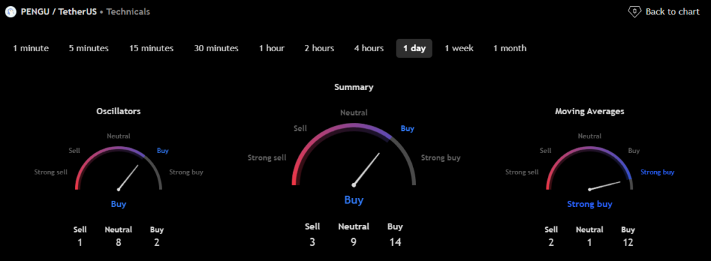 The technical analysis indicators, such as Relative Volume (RVOL), Moving Average (MA), and Relative Strength Index (RSI) of Pudgy Penguins (PENGU) are shown in the chart below.