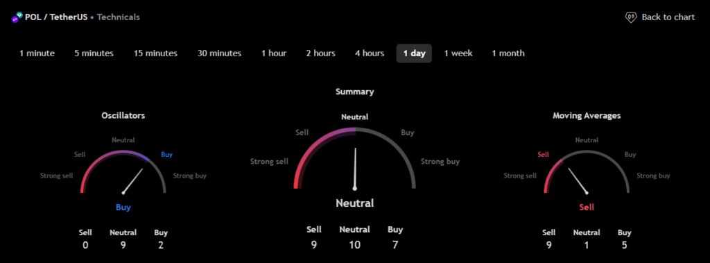 The technical analysis indicators such as Relative Volume (RVOL), Moving Average (MA), and Relative Strength Index (RSI) of POL (prev. MATIC) are shown in the chart below.