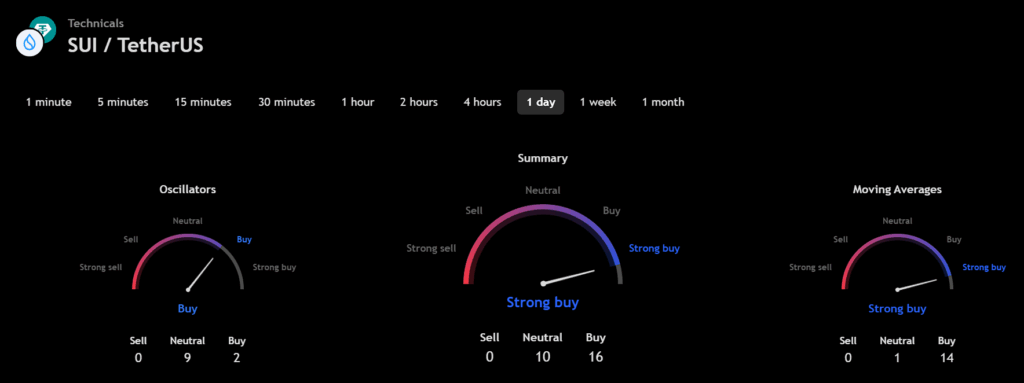 The technical analysis indicators, such as Relative Volume (RVOL), Moving Average (MA), and Relative Strength Index (RSI) of Sui (SUI) are shown in the chart below.