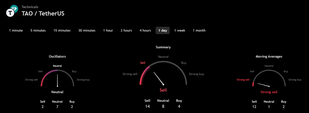 The technical analysis indicators such as Relative Volume (RVOL), Moving Average (MA), and Relative Strength Index (RSI) of Bittensor (TAO) are shown in the chart below.