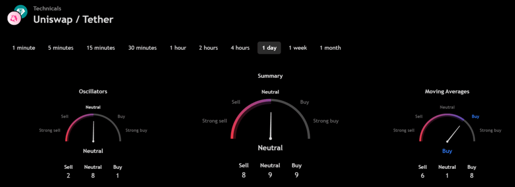 The technical analysis indicators such as Relative Volume (RVOL), Moving Average (MA), and Relative Strength Index (RSI) of Bitcoin (UNI) are shown in the chart below.