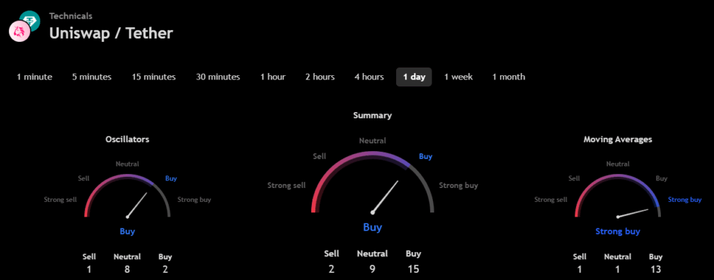 The technical analysis indicators such as Relative Volume (RVOL), Moving Average (MA), and Relative Strength Index (RSI) of Bitcoin (UNI) are shown in the chart below.