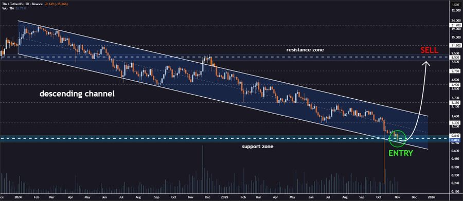Crypto analyst Jonathan Carter has emphasized that TIA’s accumulation zone remains strong, with the token maintaining support above the lower boundary of its descending channel on the three-day chart. According to Carter, this zone could serve as a springboard for a potential rebound if buying momentum strengthens.