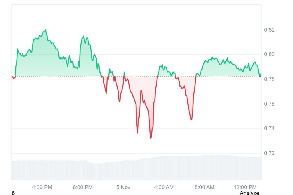 Celestia (TIA) is currently trading at $0.7851, marking a 1.58% decline in the past 24 hours. However, trading volume surged by 17.32% to $124.48 million, indicating sustained investor interest despite the short-term dip. Over the past week, TIA’s value slipped 21.2%, reflecting the broader correction seen across altcoins.