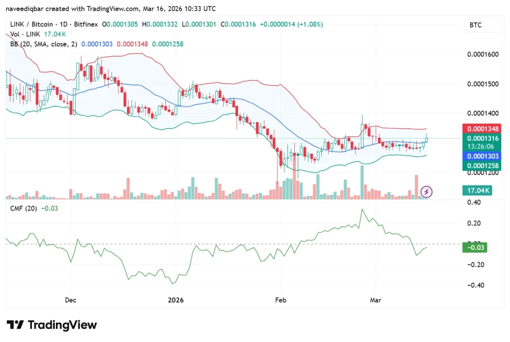 Traders need to monitor LINK/BTC’s intraday trading activity to make informed trading decisions. Chainlink’s daily chart indicates an open at 0.0001305 BTC, a high at 0.0001332 BTC, a low at 0.0001301 BTC, and a close at 0.0001317 BTC, showing a 1.15% increase in trading value. Trading volume has reached 15.16K LINK, indicating a potential bounce in intraday trading levels.