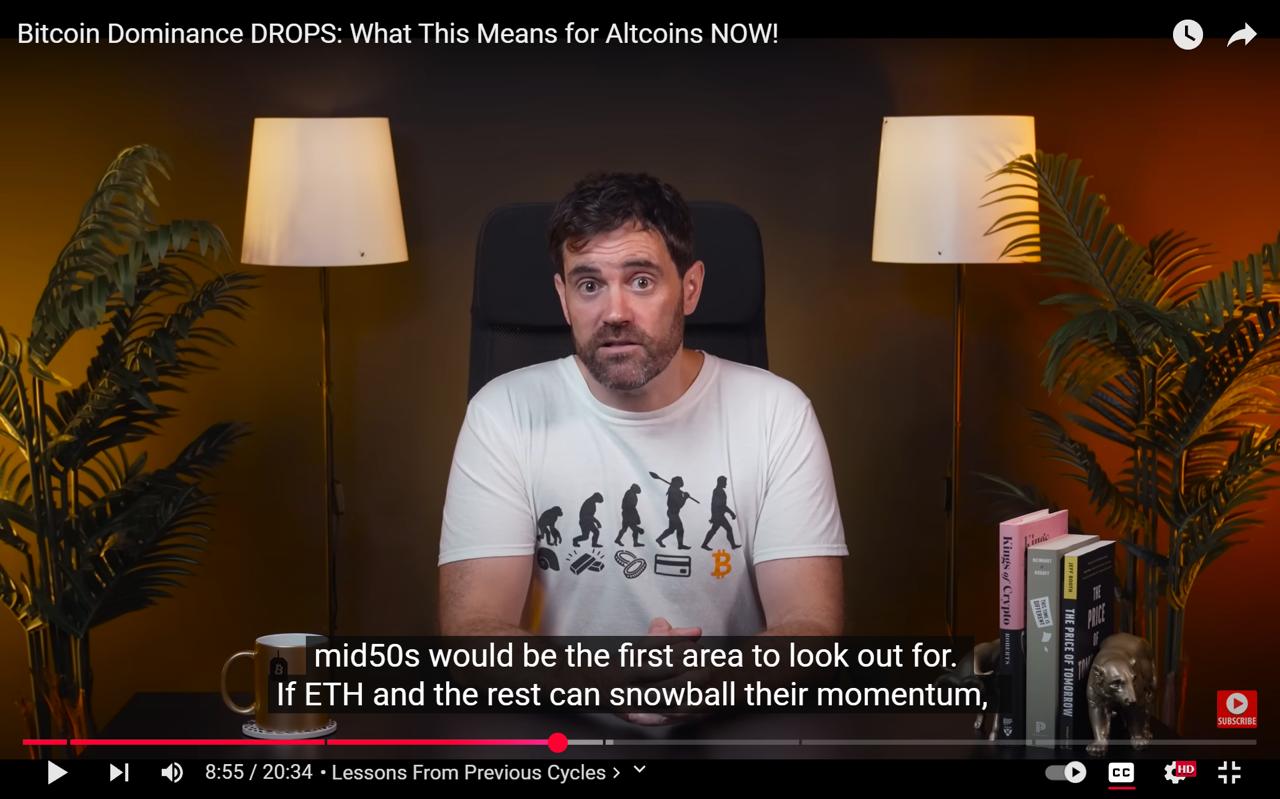 Guy Turner, widely known as Coin Bureau, views Bitcoin dominance as a key signal for when money starts shifting from BTC into altcoins. Turner’s altseason prediction echoes moments in past cycles when altcoins began to run, with Ethereum climbing sharply and Bitcoin’s share of the market pulling back from its peak. The mid-50% dominance range has been a tipping point before, often marking the start of stronger altcoin moves.