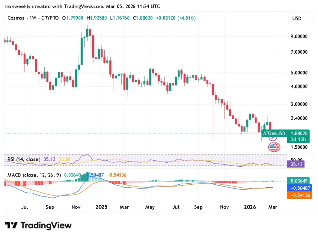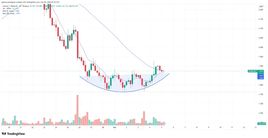 On March 5, 2026, crypto analyst Alpha Crypto Signal pointed out some bullish signs for ATOM. According to the analysis, Cosmos is likely forming a rounding bottom pattern after a long downtrend.