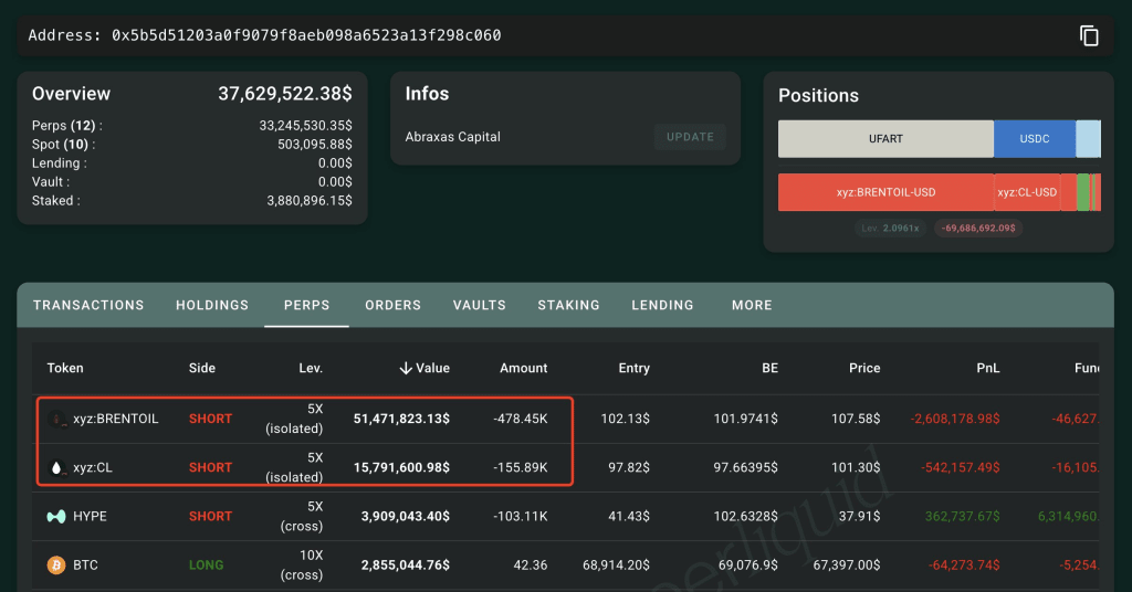 The London-based hedge fund has an estimated short position of $135 million in crude oil through the Hyperliquid exchange. This hedge fund is registered in the UK and has been transitioning to digital assets.