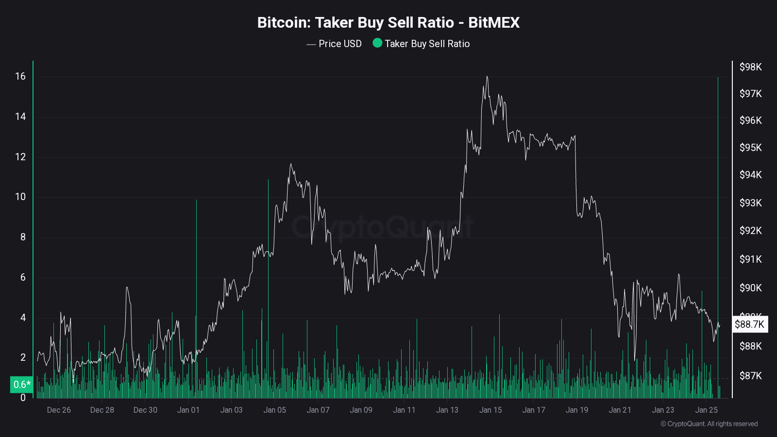 At the same time, derivatives data revealed a sharp imbalance in order flow. Bitcoin’s taker buy-sell ratio on BitMEX briefly surged to extremely elevated levels, signaling intense market buying from traders attempting to catch a rebound.