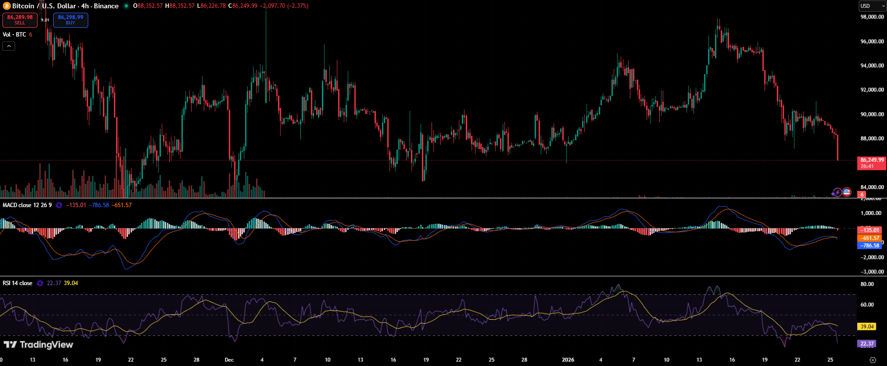 From a technical perspective, the picture has also deteriorated. On the 4-hour chart, Bitcoin has been making lower highs and lower lows since failing near the $96,000-$98,000 area earlier this month. Momentum indicators are reinforcing the bearish tone. The MACD remains deep in negative territory, while the RSI recently dipped toward oversold levels before attempting a modest bounce.