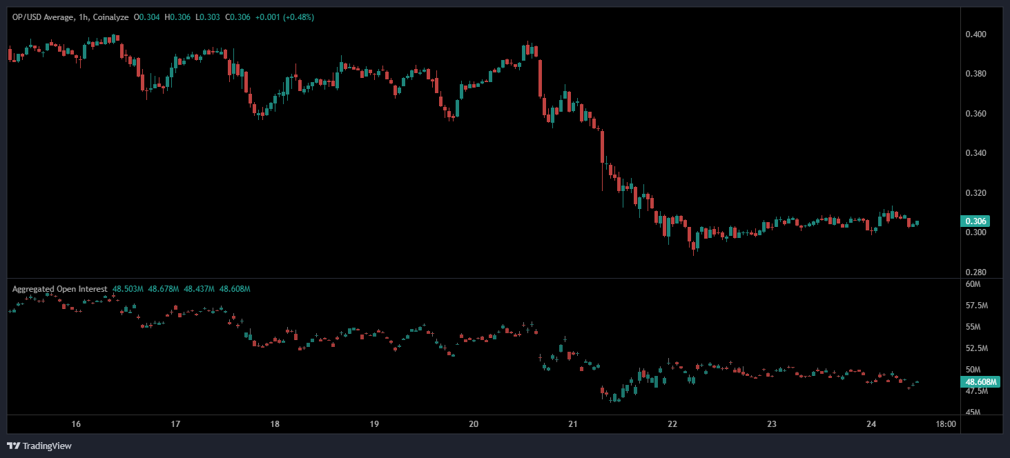 According to Open Interest data, OP/USD is trading at $0.306, posting a mild gain of 0.48% on the hour while holding in a tight consolidation zone. The hourly chart shows the coin fluctuating between $0.30 and $0.31, recovering slightly from a sharp drop that pushed the token down from $0.38 earlier in the week. This restrained rebound signals a market in pause mode, with neither side showing the momentum needed to shift the short-term trend.
