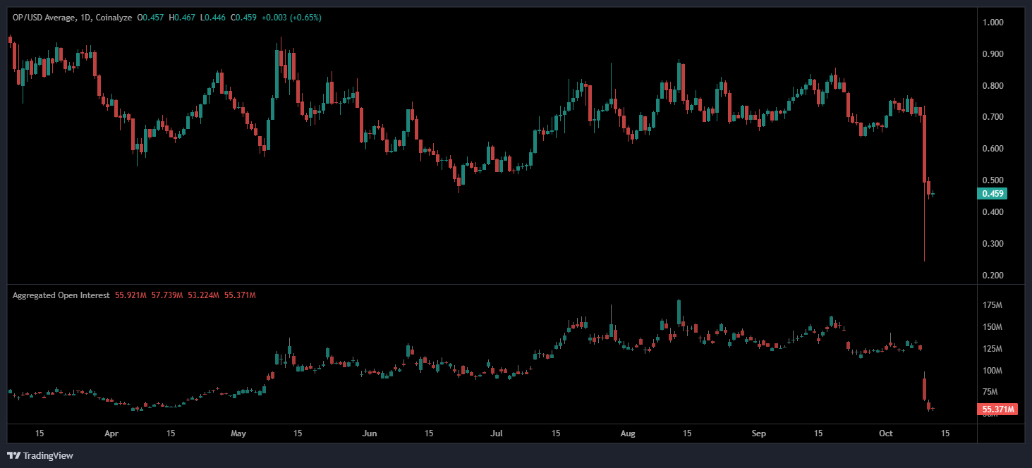 On the other hand, the open interest data paints a clear picture of capitulation. As of October 12, 2025, open interest in OP derivatives has dropped sharply, suggesting that traders are rapidly exiting positions amid thinning market liquidity. This contraction typically signals a leverage flush, as overexposed long positions are liquidated during steep declines.