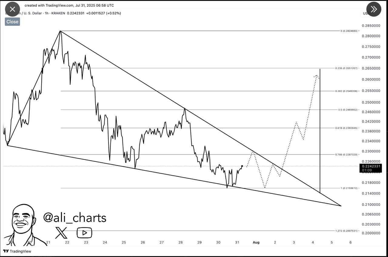 Dogecoin has formed a falling wedge, a pattern that is often seen as a precursor to an upward breakout. The price has been moving between converging trendlines, suggesting that a move to $0.265 could follow if buying pressure increases. Traders are watching the Fibonacci levels at $0.2287, $0.2392, $0.2469, and $0.2549 for confirmation of momentum.