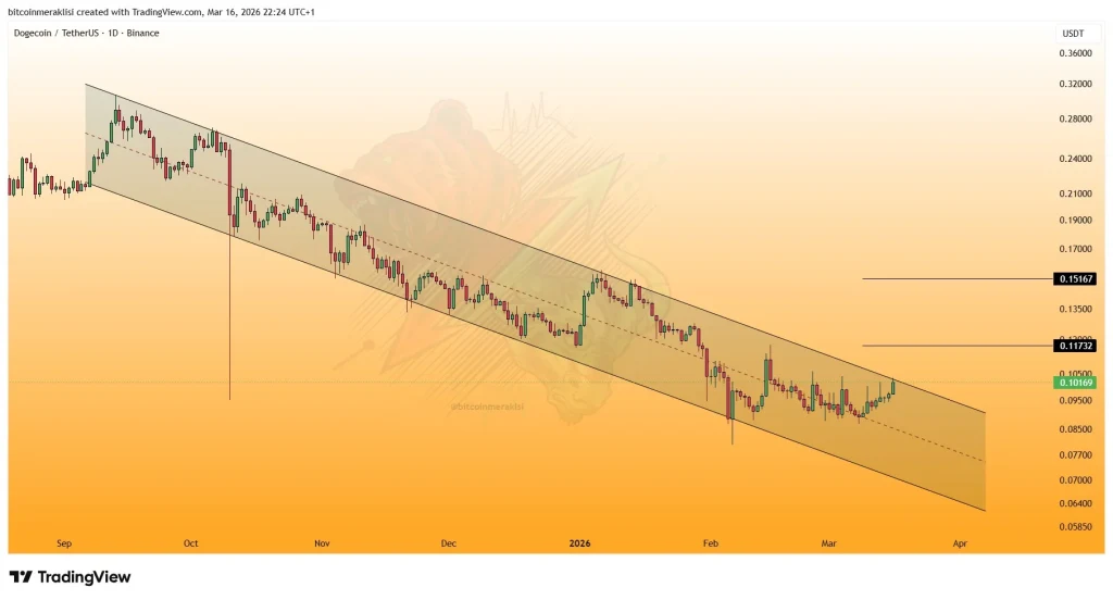 Dogecoin has remained locked inside a descending channel since September, forming consistent lower highs and lower lows. As of March 17, price action now approaches the upper boundary, showing early signs of bullish pressure building.