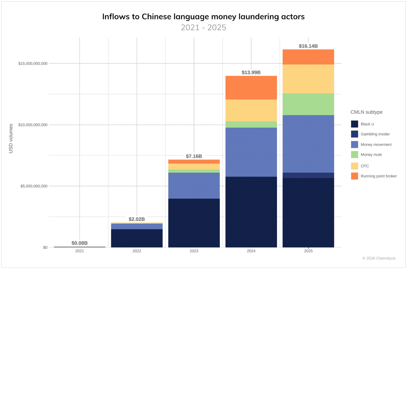 El ecosistema del lavado de dinero a través de criptoactivos ha experimentado una transformación radical y alarmante en el último lustro. Según el más reciente reporte de Chainalysis, publicado este martes, el volumen de lavado ilícito en la cadena de bloques (on-chain) aumentó de aproximadamente 10.000 millones de dólares en 2020 a más de 82.000 millones de dólares en 2025. Este crecimiento exponencial no solo refleja un aumento en la actividad criminal, sino un cambio estructural hacia redes altamente especializadas, con las Redes de Lavado de Dinero en Idioma Chino (CMLN, por sus siglas en inglés) como protagonistas indiscutibles.