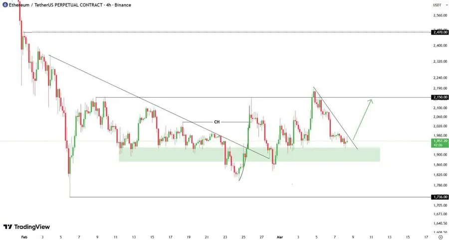 Analyst Marcus Corvinus highlighted that ETH is being firmly rejected at the $2,150 resistance. The token is currently moving down towards the $1,900 to $1,930 area. The analyst said that this area is a region of strong liquidity, currently dictating the direction of the market.