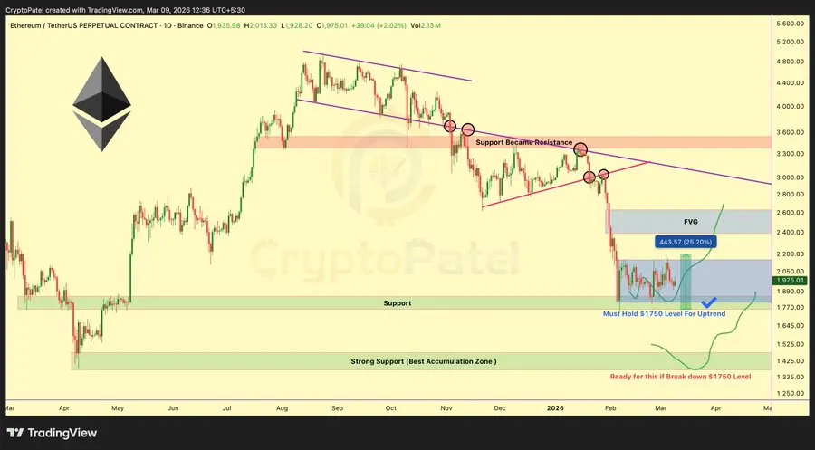 In the bearish scenario, Patel warned that if the price falls below $1,750 with volume, then the price could fall further to $1,470-$1,370. He said this area may become a preferred zone for accumulation in future cycles. The next move depends on whether buyers defend support.