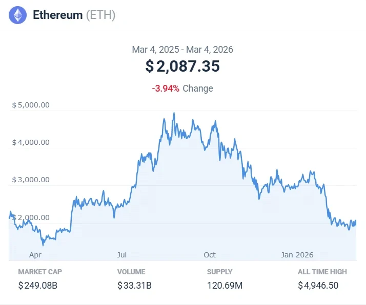 The yearly outlook also reflects a mild loss. ETH currently shows a 2.47% drop compared with last year when it traded near $2,108.13.